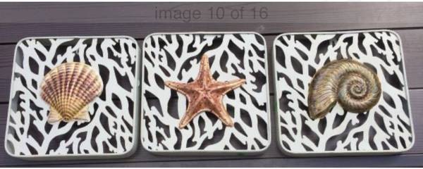 Metal shells and starfish on a coral look background for $20 for all 3. They are each 10" x 10". See my other postings with the user link. ~ Kathy