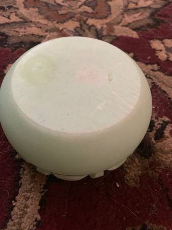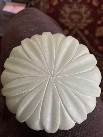 Hi I am selling this old jade stone box that’s definitely hand carved. The lines are not quite straight. The edge of each petal is slightly different. Maybe a one off piece. The pictures don’t do the color justice. It’s much more rich green in person.