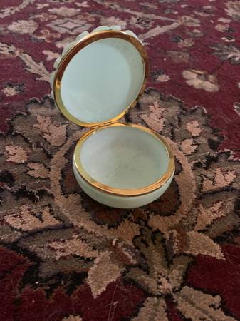 it’s really beautiful and opens on a hinge. Has gold plated copper rim. It’s about four inches wide the slightly concave interior walls indicate high quality work and make it possible to store a lot of stuff inside. Walls are surprisingly thin.