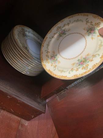 this is only like a little more than a dollar a piece for antique collectible Japanese handmade plates about 75 pieces in all matching very well made gold rimmed never used just stored away just resell them and double if you want