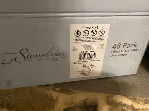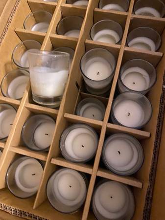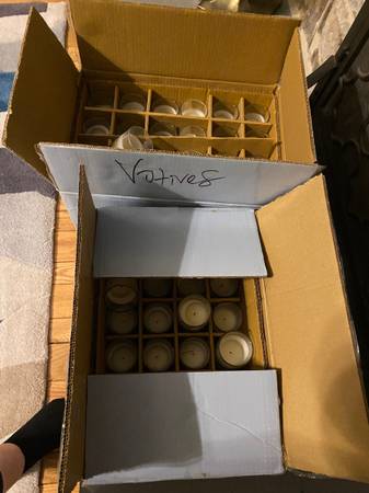 48 votives cream color. 48 in a box. Burned half way. 2 boxes - both for $15, one nox for $10