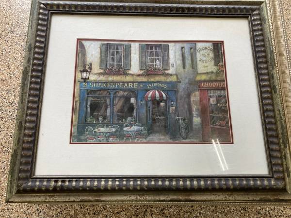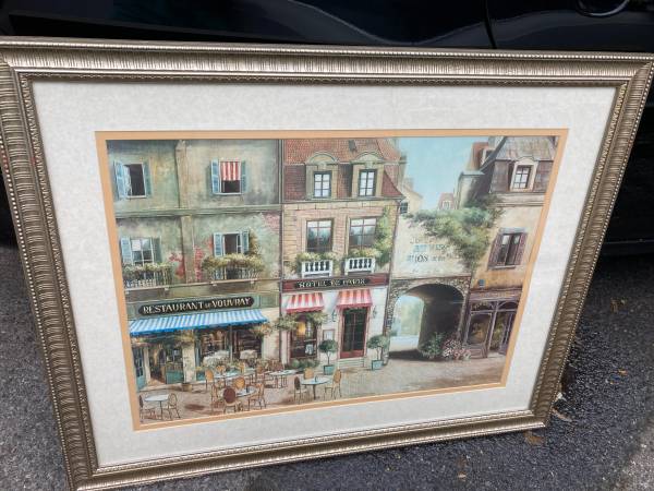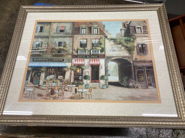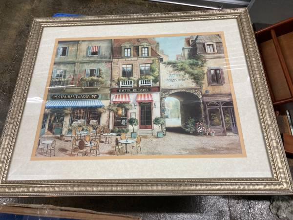 Very cute French street scene with cafe', little doggie in the window, etc. This is in a beautiful Baroque-esque frame with hanger on back. Measures 33 x 28". **Please see our other items by...