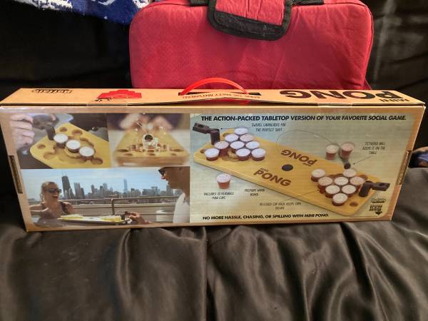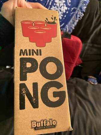 Mini-Pong - Bring The Party Anywhere Game! Mini-Pong is an action-packed, convenient tabletop version of a popular social game where players launch a ball into their opponents’ cups in an attempt to clear the board. No more hassle, chasing or spilling with this mini version! Players use catapults for finger flickin’ fun and a tethered ball that helps keep all of the parts and pieces on the table. *Perfect for happy hour, pre-games, parties and traveling with its compact size and portable features. Mini-Pong is ready to go wherever you do! *Contents include: Premium Wood Board, 2 Swivel Launchers, Tethered Ball, 25 Reusable Mini Cups. *For 2-4 players.