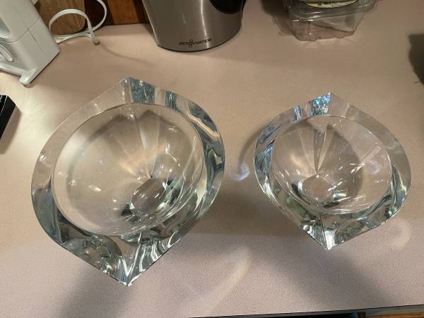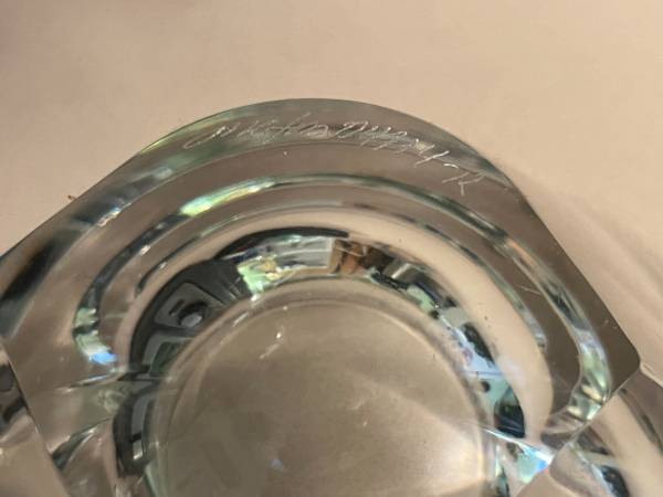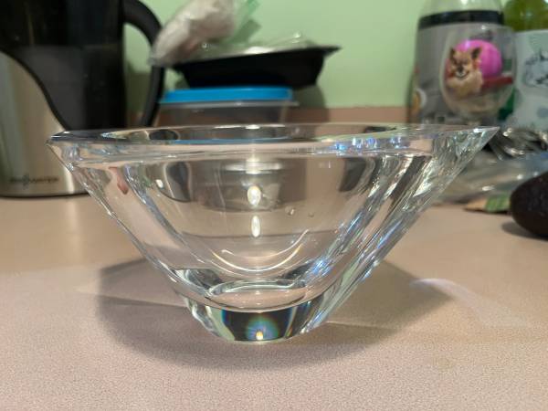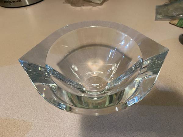 Silky smooth clear crystal. A beautiful art piece but not perfect, 1 little rim chip. See photos.