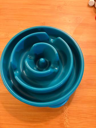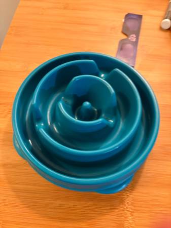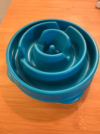 Blue slow feeder bowl for dogs. The idea is to slow your dog down from gobbling up his/her food.