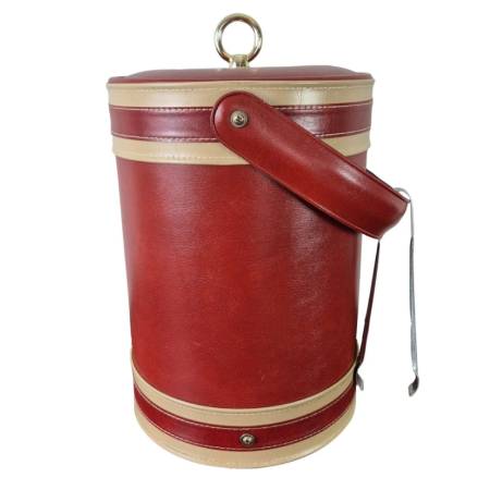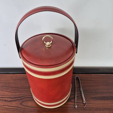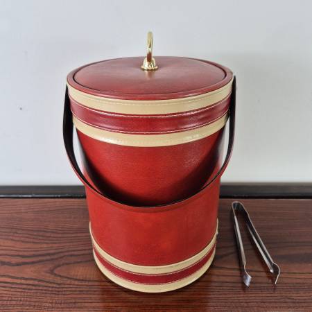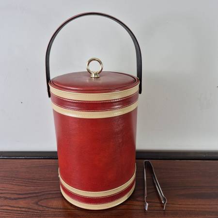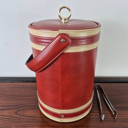 Vintage red faux leather tall ice bucket signed Georges Briard. The ice bucket is insulated inside and has a lid and a handle. Includes ice tongs, although probably not original.