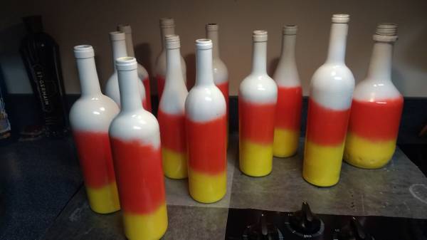 Selling 20 custom spray-painted wine bottles to look like candy corn. Great Halloween decoration for only $2 each or get all 20 at a discount for only $30 Thank you, John