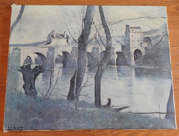 "Le pont de Mantes" reproduction on canvas -22" x 28" black/white/grey canvas reproduction of the original 1868-1870 color oil painting by Jean-Baptiste-Camille Corot that hangs in the Louvre-