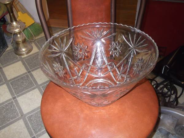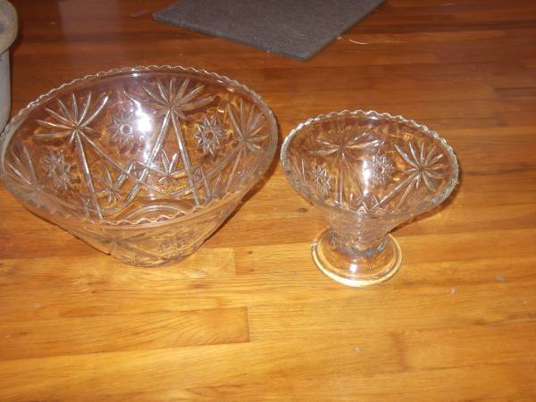 Like new two piece punch bowl with Wexford cut glass cups. The punch bowls (one full size, one smaller can be used separately or mount the larger onto the smaller, using the smaller as a stand....