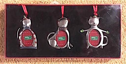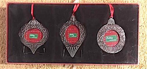 New in box-- gift set of three ornaments per box, silver finish, designed to hold small personalized photo. Each hangs from a red ribbon and also has a stand that allows you to display as small tabletop frame (visible in photos of boxed ornaments). I have three individual gift boxes: two are the same and are various-shaped Christmas ornaments; the third box is whimsical dog and cat ornaments. Give individual ornaments or an entire set as a gift! $8 each box or all three for $20. Silver Spring, just north of Colesville and off of New Hampshire Ave.