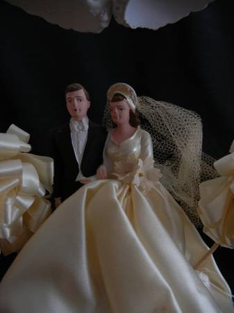 11" cake topper , vintage , 1950s, bells and people are made of clay not plastic ,INTERESTED OR QUESTIONS SEND NAME PHONE # AND BEST TIME TO REACH YOU