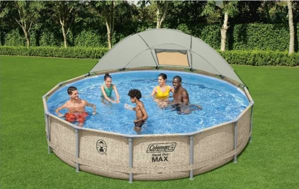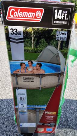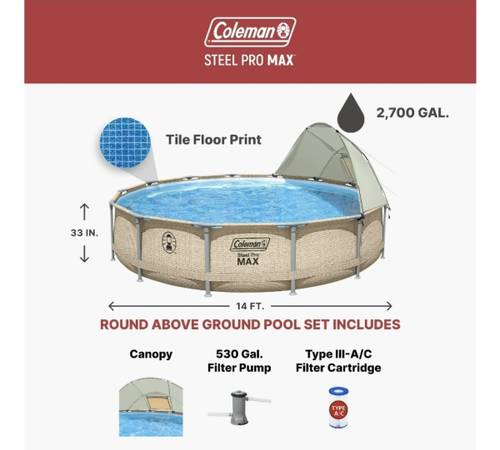 The Coleman Steel Pro Max 14'x 33" Round Metal Frame Above Ground Pool Set is a durable and easy-to-assemble pool perfect for backyard fun. It features a corrosion-resistant metal frame with a ClickConnect System for quick setup and a 3-layer DuraPlus liner thatis 15% more tear resistant, 33% more stretch resistant, and 83% more puncture resistant than standard PVC. The pool has a water capacity of 2,700 gallons and comes with a 530-gallon filter pump and a canopy for shade. It's easy to set up anc take dlown, with no tools required and ncludes a built-in flow control valve for easy drainage.