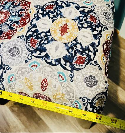Set of four, sturdy and well made, solid wide chairs. Recently re upholstered with two different designs. Price to sell. Price for all four chairs.