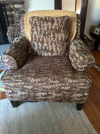 Beautiful brown and gold floral embroidered side chair - very comfortable and in good condition. Comes from pet friendly home.
