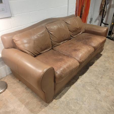 Brown leather sofa - in great shape. No tears. Some scuff marks. $80 obo