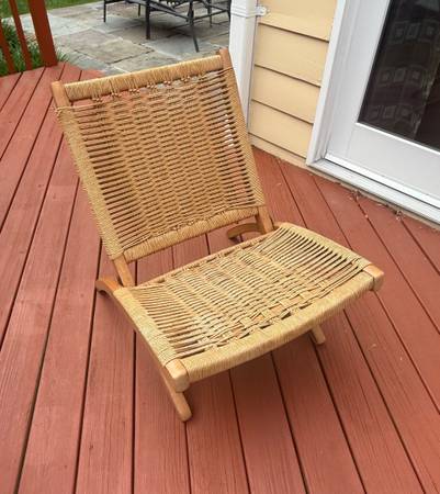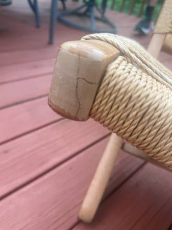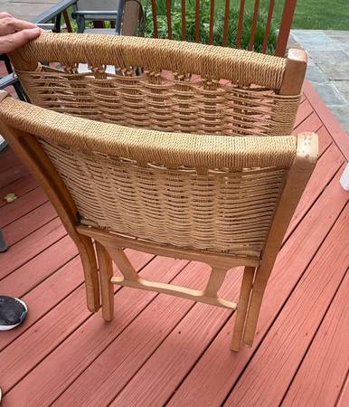 Vintage mid century modern Scandinavian Hans Wegner style folding rope lounge chair dates back to the 1970’s. In good overall condition. Wooden arms show some wear See photos as they are part of the...
