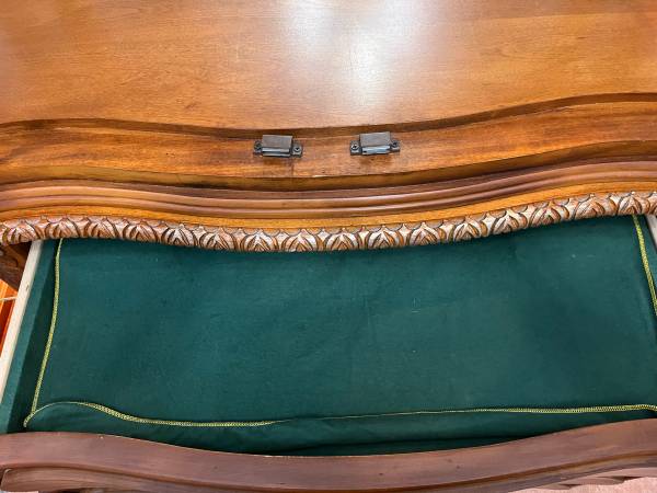 Buffet with glass windows, mirrored glass interior, 1 clear glass shelf and display lighting, 4 fabric lined drawers, top drawer storage for fine china and also separate storage for silverware which is removable.