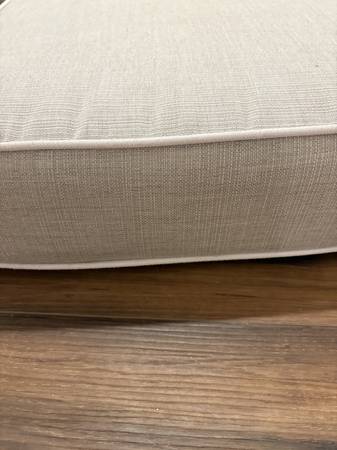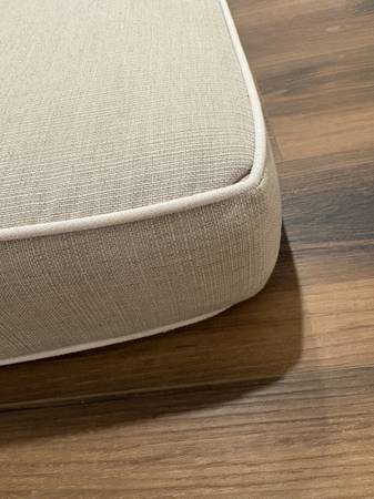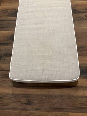 Extra long, custom-made bench cushion in perfect condition. 5'' deep x 20'' wide x 108'' long. Linen blend fabric with piping.