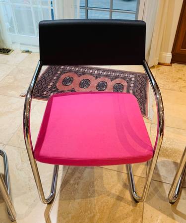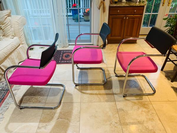 Midcentury Modern “Moment” Chair Set of 3 by Knoll. Beautiful upholstery in pink, black banking and chrome frame. Designed by Jeffrey Bernett and Nicholas Dodziuk.