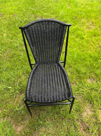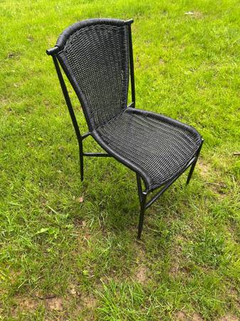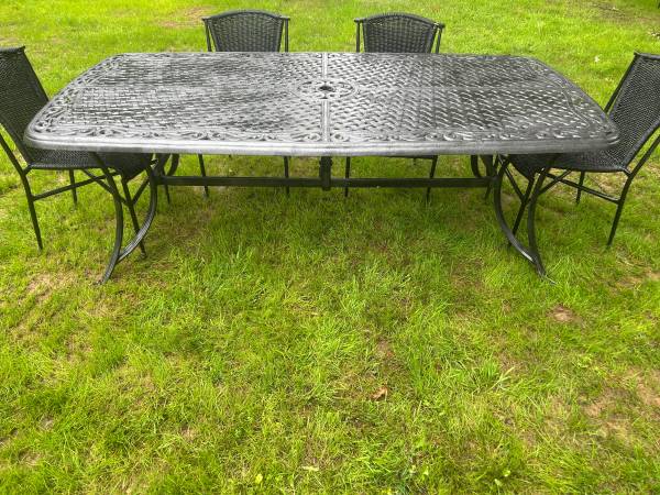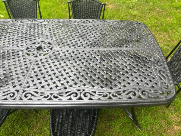 Perfect for your outdoor space! The cast aluminum table measures 84x42x28 and the wrought iron chairs measure 18x16x32.5 Very sturdy Delivery available!!
