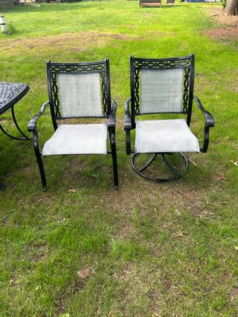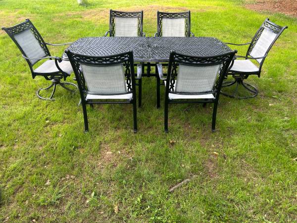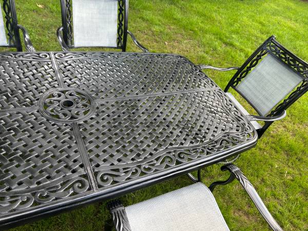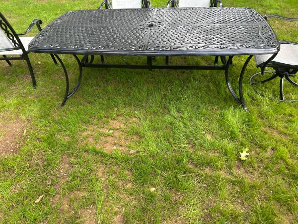Perfect for your outdoor space! The table measures 84x43x28 and the chairs measure 20x27x36 Very heavy The set has been refinished Delivery available!