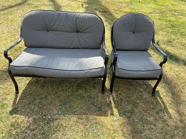 Perfect addition to your outdoor space! The couch measures 48x23.5x35 and the oversized chair measures 23.5x25x35 The cushions have a few small holes Delivery available!!
