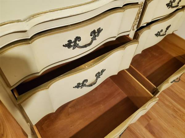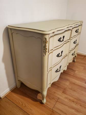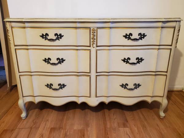 Solid wood French provincial style dresser with 6 drawers in very good condition, $95. It measures 53.5"W x 20.5"D x 35.5"H.