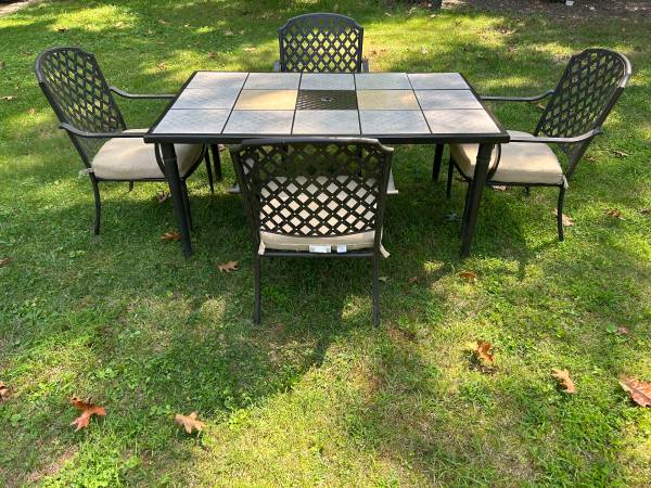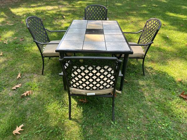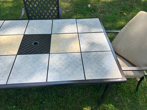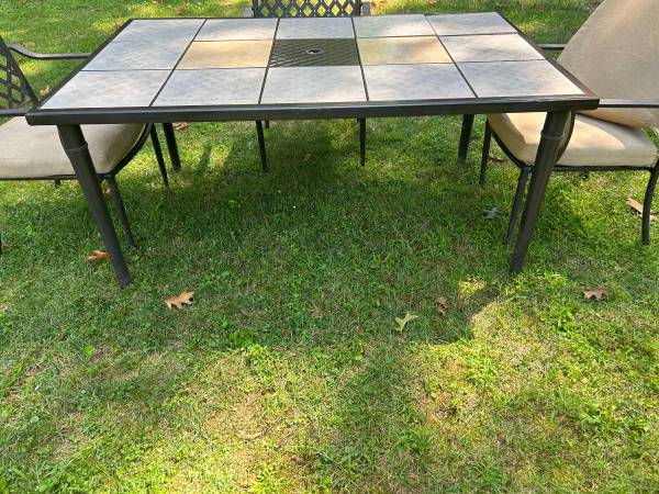 Perfect for enjoying this great weather! The table measures 63x38.5x28.5 and the chairs measure 21x25x36 The tiles are interchangeable Delivery available!!