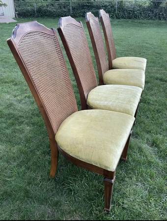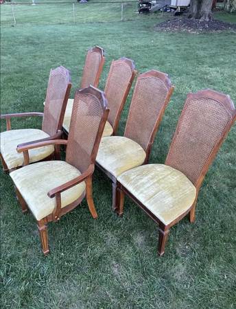 6 Beautiful Lenoir cane back chairs I believe they are from the 70s They measure 17.5x19x41 They do require some tlc. Tightened screws, cleaning of the seats, and some waxing. One leg has a 3 or so...