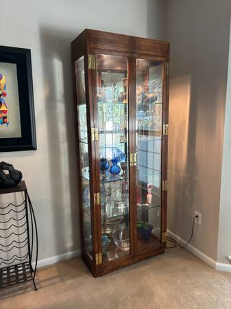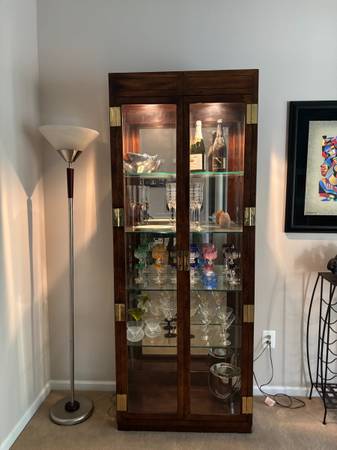 Two matching wood cabinets. Glass walls and doors. Mirrored back. Four adjustable-height glass shelves. Recessed lighting. Brass hardware. Both are in terrific shape!