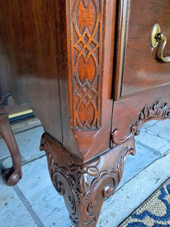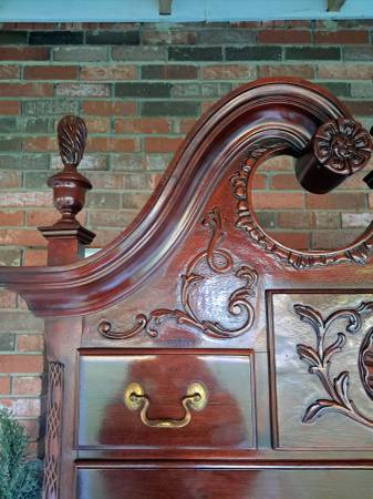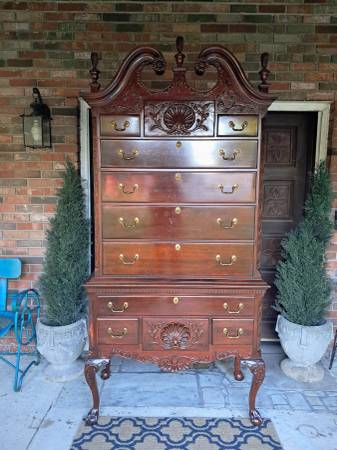 Vintage solid mahogany Queen Anne style highboy dresser by Drexel Furniture. This dresser has 2 pieces, a bottom chest and a top chest, which rests on top and is removable. This version of the Queen Anne highboys is very ornate.
