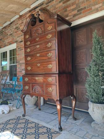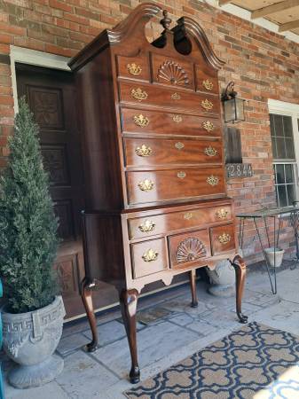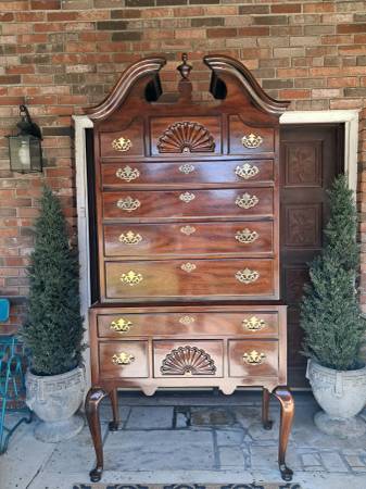 Vintage solid mahogany Queen Anne style highboy dresser by Drexel Furniture. This dresser has 2 pieces, a bottom chest and a top chest, which rests on top and is removable.