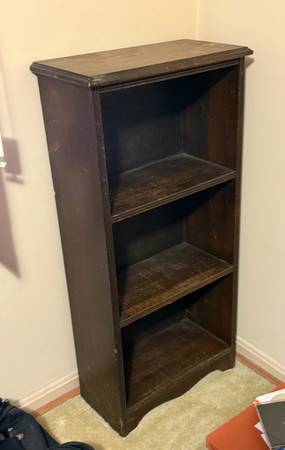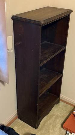 Antique Dark Brown Wood Small 3-Shelf Bookcase 38”height, 18 1/2” length, 9” depth. See photos for condition. All shelves sturdy.