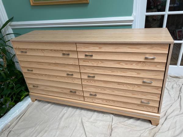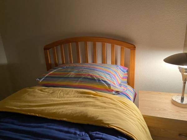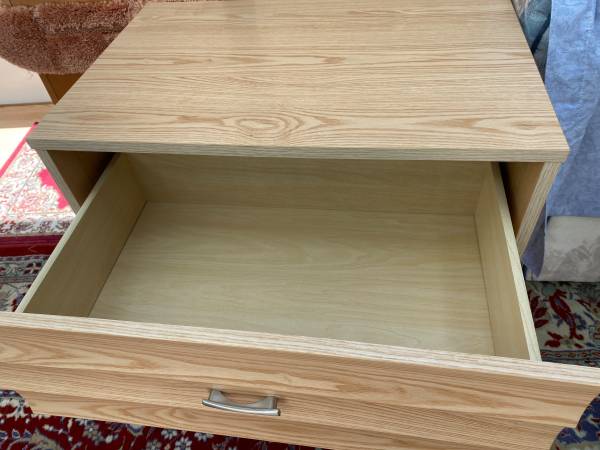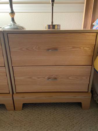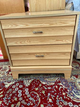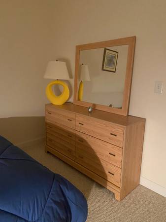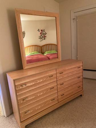 Brand new Bedroom chest with mirror and 1 nightstand - $265. Set of oversized single mattress and boxspring with bed frame (as shown in pictures) - $175