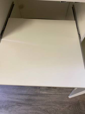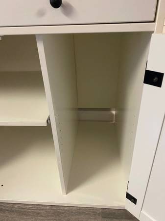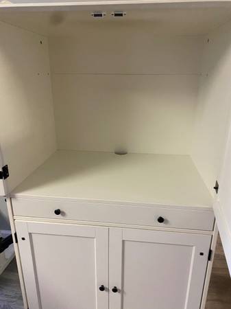 Display monitor area with closed doors to be hidden. Pull out drawer for your keyboard. Lower partition has a place for your desktop computer and shelves/pull outs for storage or printer.