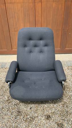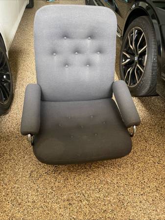This vintage Ekornes recliner is a beautiful addition to any mid-century modern decor. The chrome finish and gray cotton upholstery give it a sleek and stylish look. The reclining chair features tilt control knobs on either side of the chair