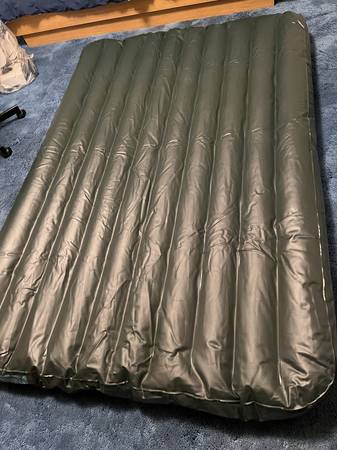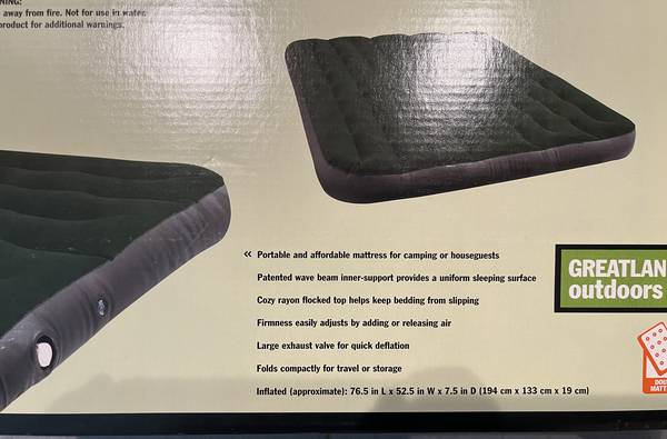 Double fabric airbed by Greenland Outdoors. Never used, inflated to test (see pic). Electric air pump with 9 foot cord. Four valve adaptors included.