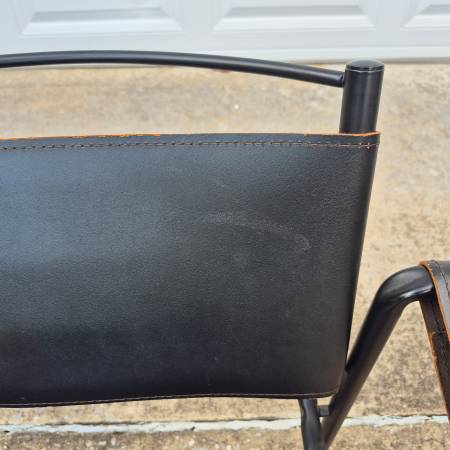 The 1970s era chairs are in excellent vintage condition. The chairs are sturdy, surprisingly comfortable, and very cool to look at. The leather shows signs of wear, including finish loss at the edges and small cracks in the finish where the leather bends. The powder coated frame is in great shape with just a few nicks on the back handle and on the legs. All steel springs are original and intact with minor rust. The undersides of the seat panels where the springs are attached had some torn grommet holes, which have since been professionally repaired with new grommets. Please see photos for details about condition.