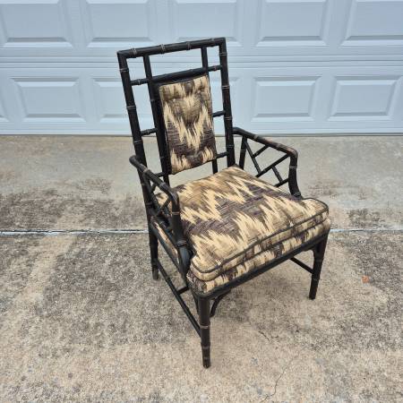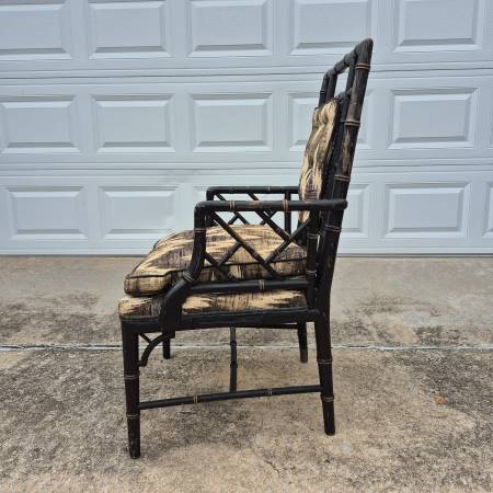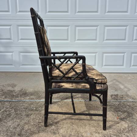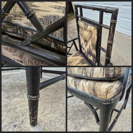 The chair is in good vintage condition. The chair is sturdy and solid at every joint. All fretwork and cane is intact with no missing pieces. The painted finish is worn and chipped. The upholstery is a bit faded but clean with no visible stains. The fabric was torn on one side of the seat but was subsequently mended. The black faux leather piping on the chair seat is worn. Please see photos for more details about condition.