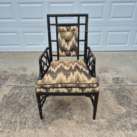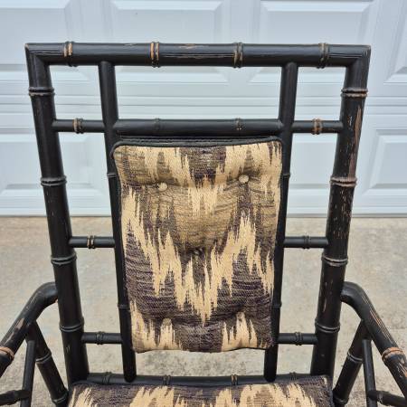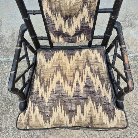 The chair wears an older coat of black, which has worn, chipped, cracked, and distressed over time. The wear pattern actually seems to echo the staccato pattern of the upholstery fabric.