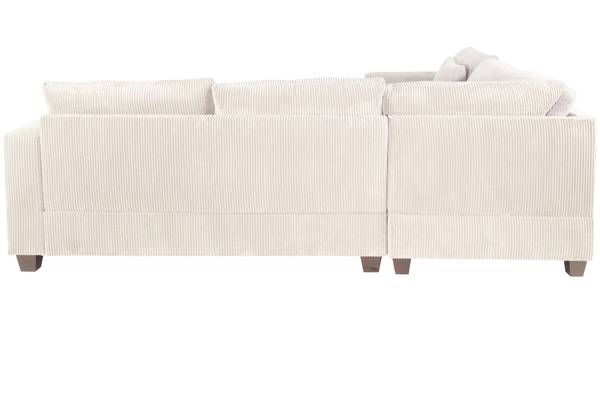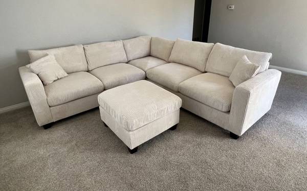 Brand new ivory color corduroy sectional sofa with ottoman and 2 accent pillows.