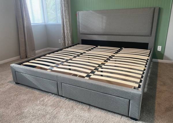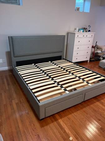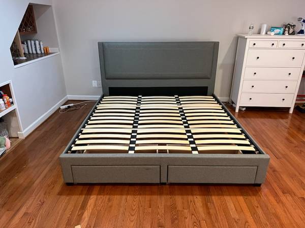 Brand new king size grey linen upholstered platform bed frame with storage drawers. Comes new in 3 boxes. Assembly required. Includes hardware and instructions. No box spring needed. Delivery 🚚 for...