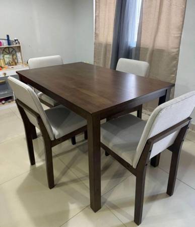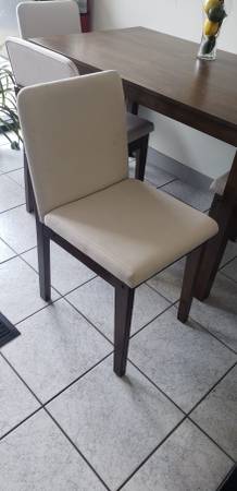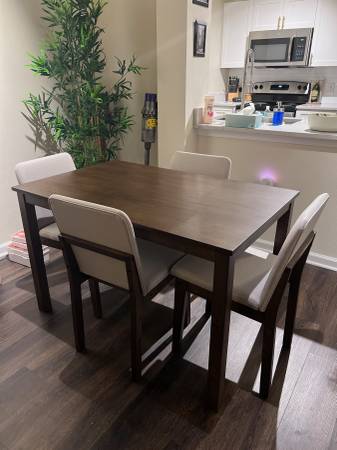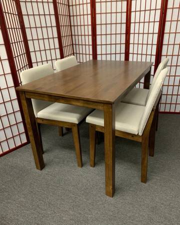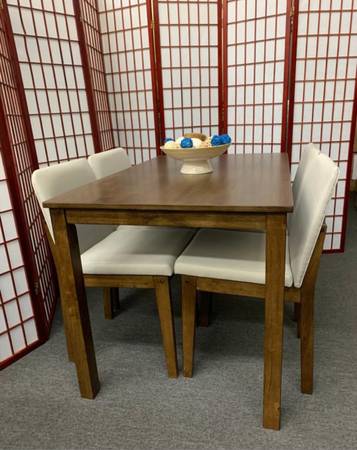 Brand new 5 Piece walnut color wood dining set. Comes new in the box. Assembly required. Includes hardware and instructions. 47x30x30h. White fabric chairs. Firm price Fits in an SUV or Minivan...