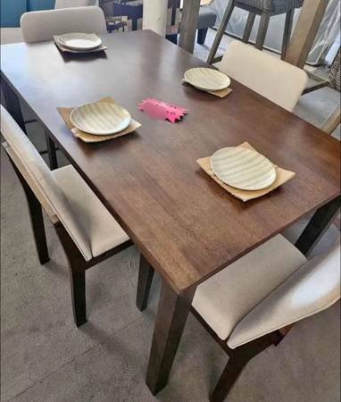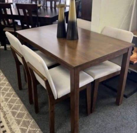 Brand new 5 Piece Wood Dining Set. Comes new in the box. Assembly required. 47x30x30h. Walnut color. Delivery 🚚 for additional fee. Firm price