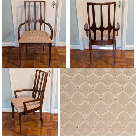 Classic Broyhill Brasilia matched surfboard table, leaf, and chairs dining room set. Made of solid walnut with an iconic mid century modern silhouette.