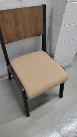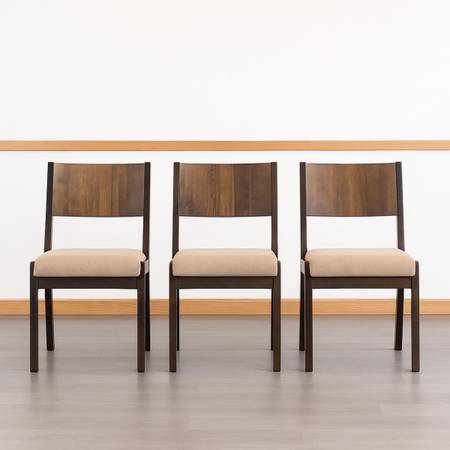 A clean, modern set of 3 matching dining chairs with wood backs and beige upholstered seats.