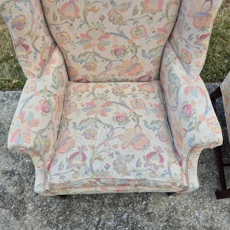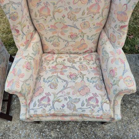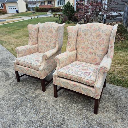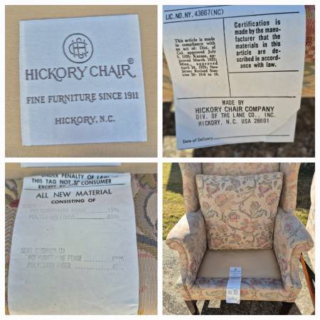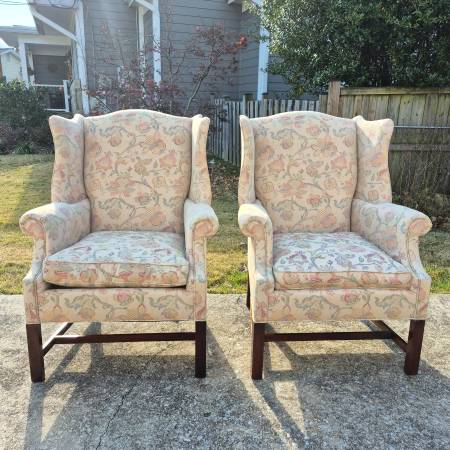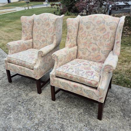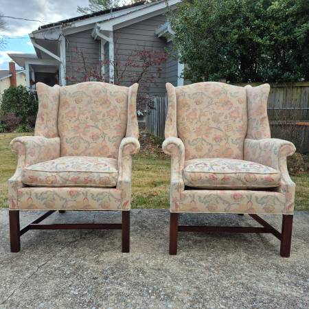 This is a pretty pair of wingback arm chairs by high end American furniture maker Hickory Chair of Hickory, NC.