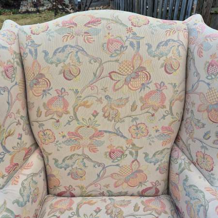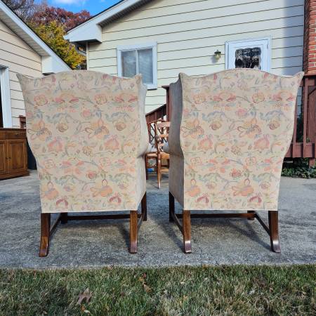 The chairs have a classic wingback form with rolled arms and chippendale style legs. The crewel style upholstery fabric features an lovely but subtle floral pattern on a neutral beige field. Signed Hickory Chair under the seats.
