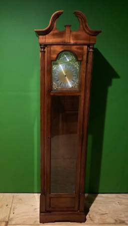 Extremely cool clock. Does not have mechanism nor weights, does have chimes. You could swap the mechanism of your similar clock into this one if yours has lots of wood damage or stick a $10 electric mechanism in it and put shelves below for a neat curio case that also tells time. $40 firm. I do not have key.