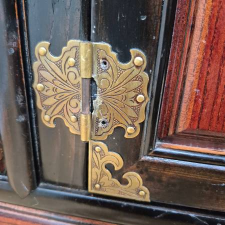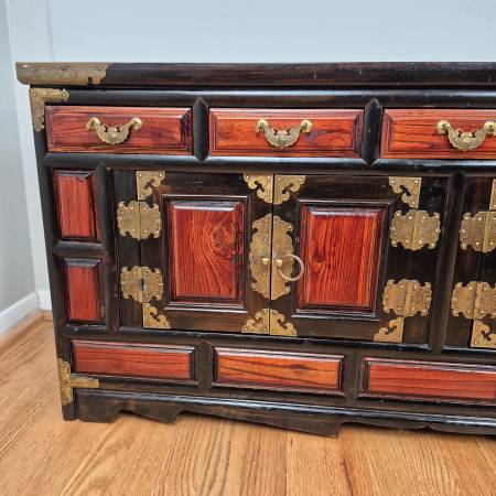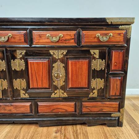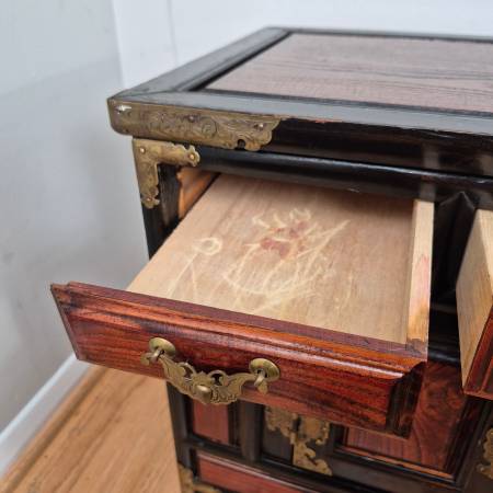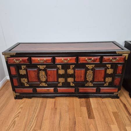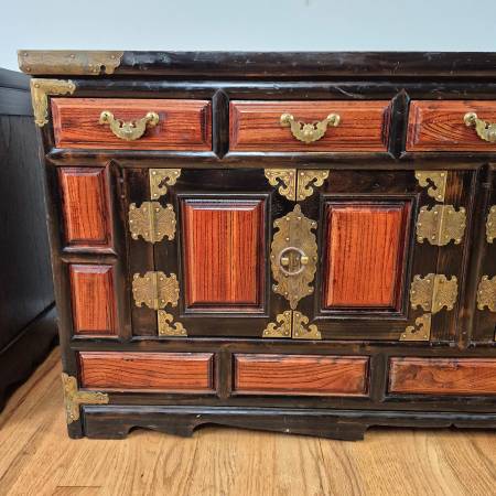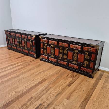 The cabinets are made of dark stained solid wood that frame decorative panels of elm stained a reddish brown to highlight the beautiful grain of the wood. The cabinets are accented with ornate brass campaign style brass fittings, including corner brackets, shaped hinges and lock plates, and bat shaped drawer pulls. The cabinets are elevated on short legs united by shaped wood aprons on three sides. These pieces were imported from South Korea.